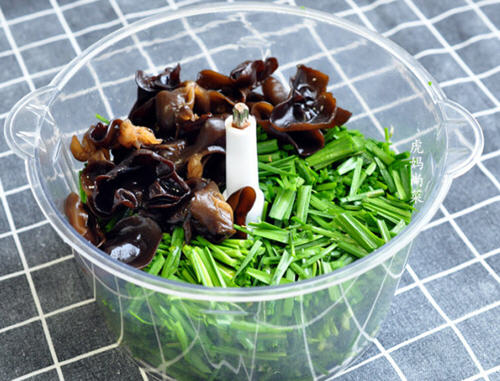 2、将洗净切段的韭菜,泡发的木耳,一起放入切菜器,转一转,切碎。