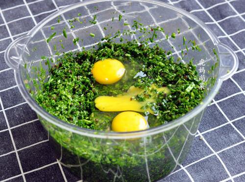 3、然后磕入鸡蛋,再加入橄榄油拌匀成糊状。先不要放盐,啥时候用啥时候再放,以免杀出韭菜的水分。