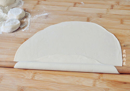 4、馅料准备好了面团也醒的差不多了,取出到面板上,揉匀后分成50克一个的小面剂子,取一个擀成薄薄的大面片,越薄越好。一次擀好两张。