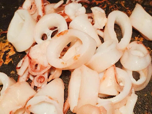 5、干锅不放油,中小火干煎鱿鱼圈,煎到有点焦香