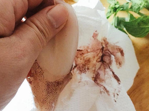 2、先处理花工的鱿鱼,外膜可去可不去,利用厨房纸巾就可以把外膜撕的干干净净