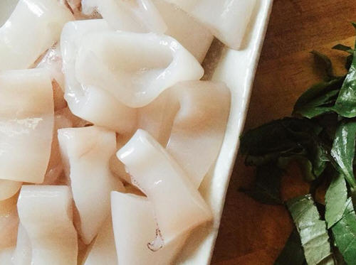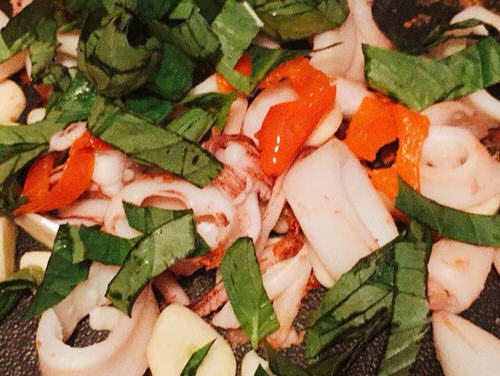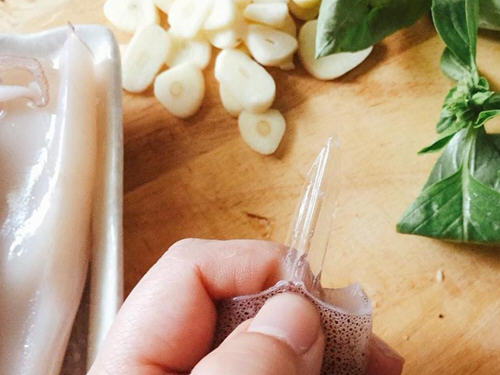 4、内腔清洗干净后,切大块。头部的部分,触须切大段,取的墨囊那一大段跟眼睛嘴巴什么的,我没用~ 蒜头切末或切片,九层塔可切大块或不切,喜辣的辣椒可不去籽切小片,这道菜要有点辣才够味!