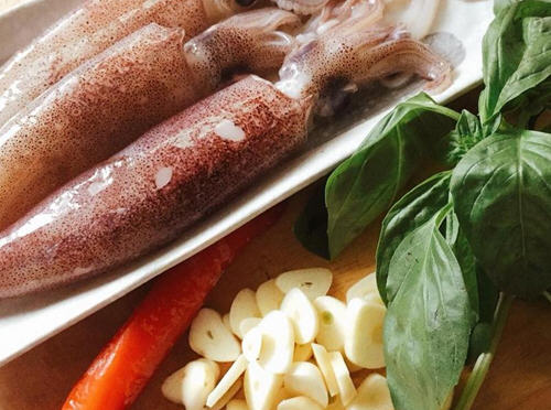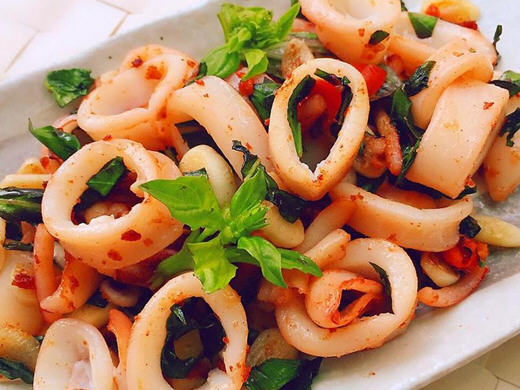 主料:小鱿鱼3尾、九层塔适量、蒜8颗