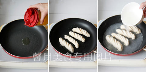 8、不粘平底锅倒入少量油(份量外),烧热后转中火,将生坯排放入锅,略煎至底部开始变硬;