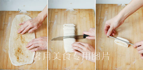5、从面皮的一端卷起,收紧底边,切成约3厘米宽的小段。