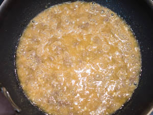 4、炒至香味出来时,转小火,下调味料一续煮。
