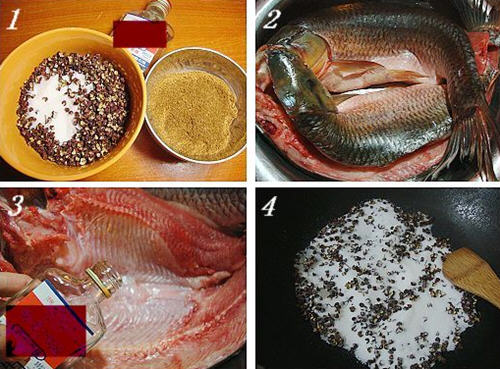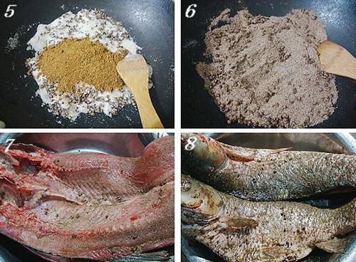 6、晾凉的花椒盐,然后均匀抹在鱼肚,鱼头,鱼全身都抹上,外面也同样摸匀花椒盐,然后放一在盆子里。上面可以用用一个大点的袋子覆盖住鱼,以免腌的过程中鱼肉表皮干掉,放阴凉处,腌制6天左右。
