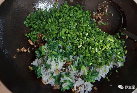 6、凉了以后放小白菜和粉条末,再放韭菜,放香油后完全拌匀就可以了。
