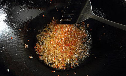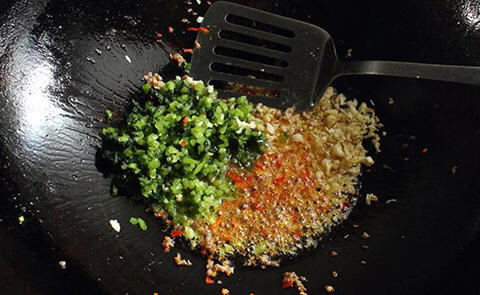 3、不用刷锅,把煎鱼油倒掉,再放一些新油,中火先煸一下肉末,煸的稍干一些
