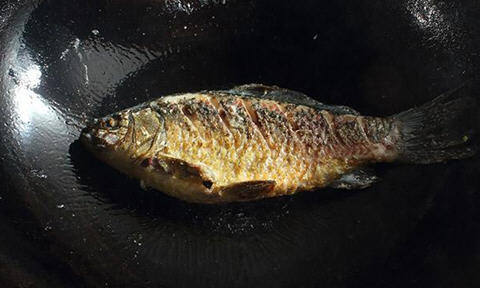 4、煎鱼的时候鱼一下锅先不要动,等一会儿再动,这样鱼皮不容易烂掉。