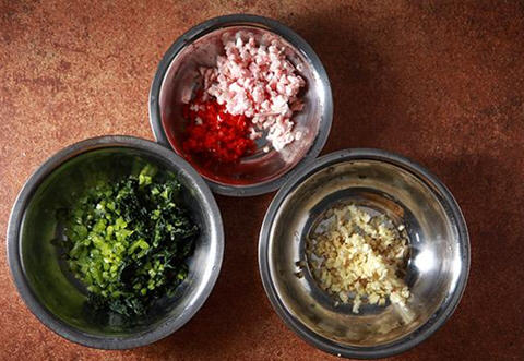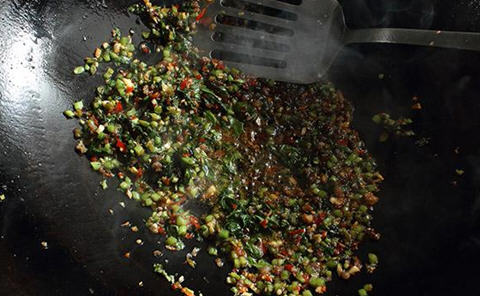 5、雪菜一定要煸炒一下才会更香,切记!如果为了好看,那么就光用雪菜的梗,这样切出来是一粒一粒的,我是连叶子一起用了,所以看起来有些凌乱。
