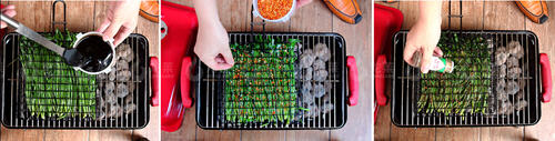 5分钟后将装有韭菜的烤鱼网放入烤炉上,焖烤5分钟。