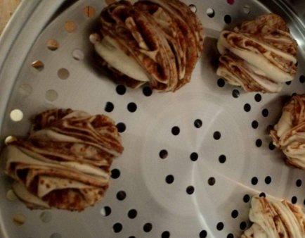 6、蒸锅中水开后,把花卷放进蒸锅,大火蒸15——20分钟即可,具体根据花卷的大小决定,蒸锅中可以铺一层油纸或者在篦子上刷一层薄油,这样出锅时芝麻酱花卷不会粘锅。