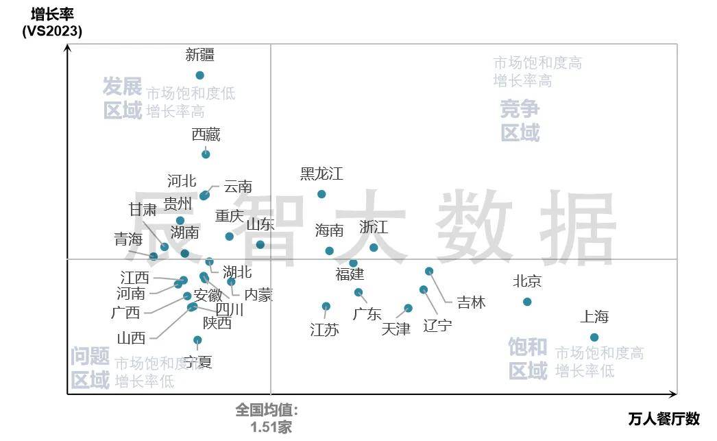 结合万人餐厅数与门店增长率来看,北京、上海、天津三个直辖市与辽宁、吉林等省份已经饱和,偏西部的地区(如西藏、新疆、青海、甘肃)和云南、贵州等地市场饱和度较低且门店增速快,颇具发展潜力;海南、黑龙江、浙江三大区域虽市场竞争激烈(市场饱和度较高)但仍保持较高的增长速度。