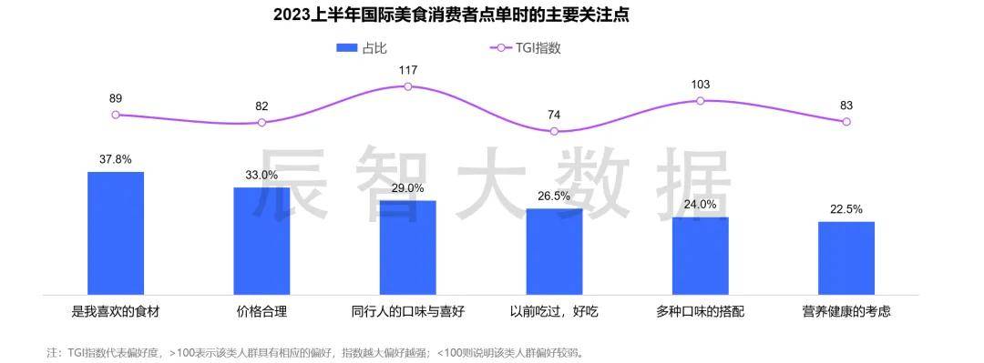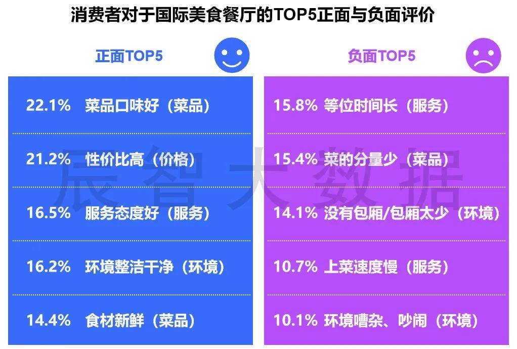 食材、价格是国际美食食客点单时的主要关注因素,性价比高与菜品口味好也能让国际美食餐厅更容易收获消费者的好评,性价比和口味仍是当前国际美食餐厅的致胜关键,但在品牌饱和市场竞争激烈的当下,注重全面发展的国际美食餐饮可以在竞争中脱颖而出。