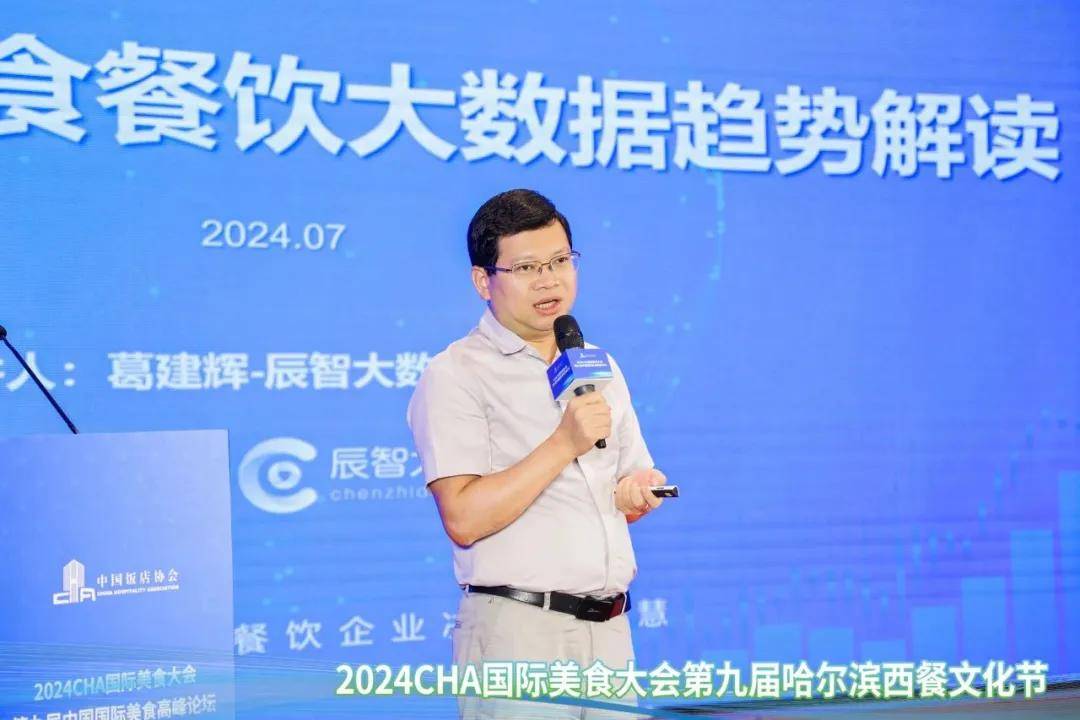 大会现场,辰智大数据创始人、餐饮企业数智化增长参谋长葛建辉解读了 《2024 国际美食餐饮大数据趋势》 ,发布国际美食新发展趋势,助力国际美食高质量发展。