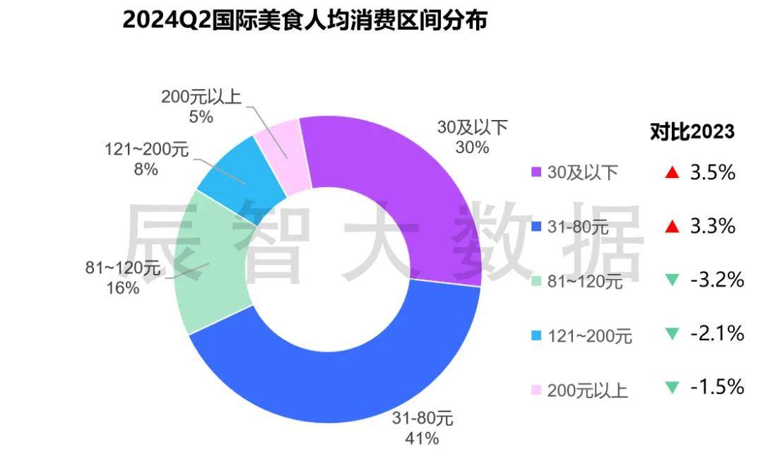 另一方面,相较于去年年底, 2024Q2人均80元以内价位的占比上升,80元以上占比下降 ,国际美食消费呈现降级趋势。