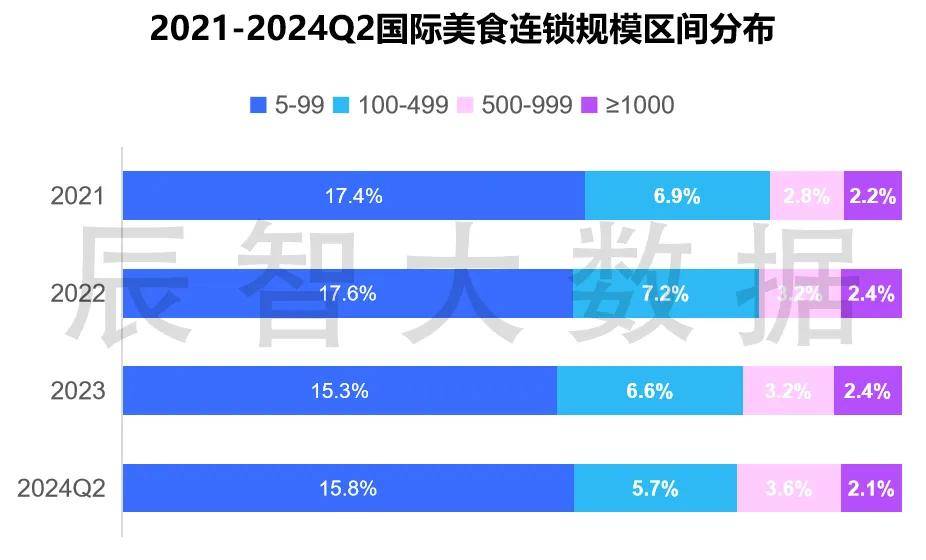 国际美食的连锁品牌中以成长型中小品牌为主,从连锁规模分布来看,门店规模100家以下的小微连锁品牌最多,占据了该市场半数以上的份额,其次是100-499家店的品牌;500-999家店的品牌数量正呈现增长趋势,而1000家店以上的连锁品牌数量保持相对稳定,三年来均占2.3%左右。