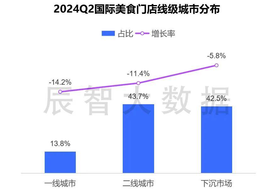 2024上半年, 一二线城市国际美食餐厅门店减幅都超过了10%, 下沉市场(三、四、五线城市)规模虽然也有所萎缩,但是下滑幅度明显低于一二线城市。
