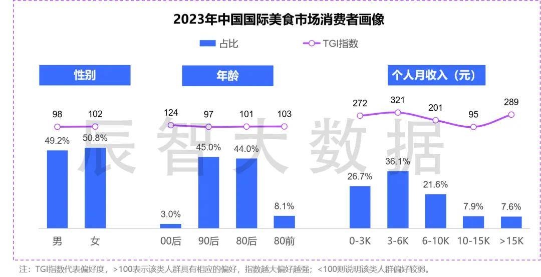 2023年针对约5.8万消费者的日常就餐跟踪发现,约3.7%的消费者外出就餐时选择了吃异国菜,其中男女近半,80后、90后中青年食客与中低产阶层群体居多,从TGI指数来看高收入消费者对异国菜的喜爱度高于总体水平。