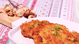 土豆、胡萝卜擦丝,加入鸡蛋,调味料、面粉,搅拌均匀,放在锅里煎制即可。