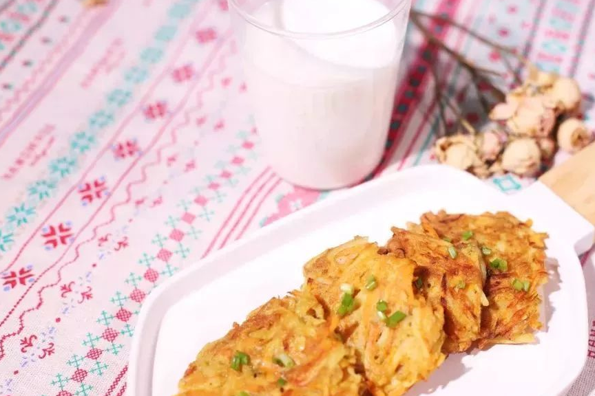 做的时候注意,土豆丝多些,胡萝卜丝少些,因为土豆淀粉含量高,可以作为主食食用,而且淀粉让饼更容易成型,不会散。