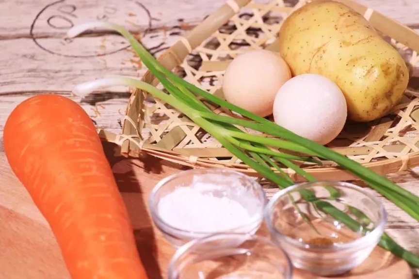 土豆1个、胡萝卜1个、小葱2根、面粉1勺、鸡蛋2个、盐胡椒粉适量