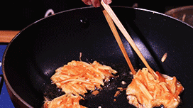 5.筷子压一下容易成型,煎3分钟左右翻面,喜欢脆一点的可以煎久一点~