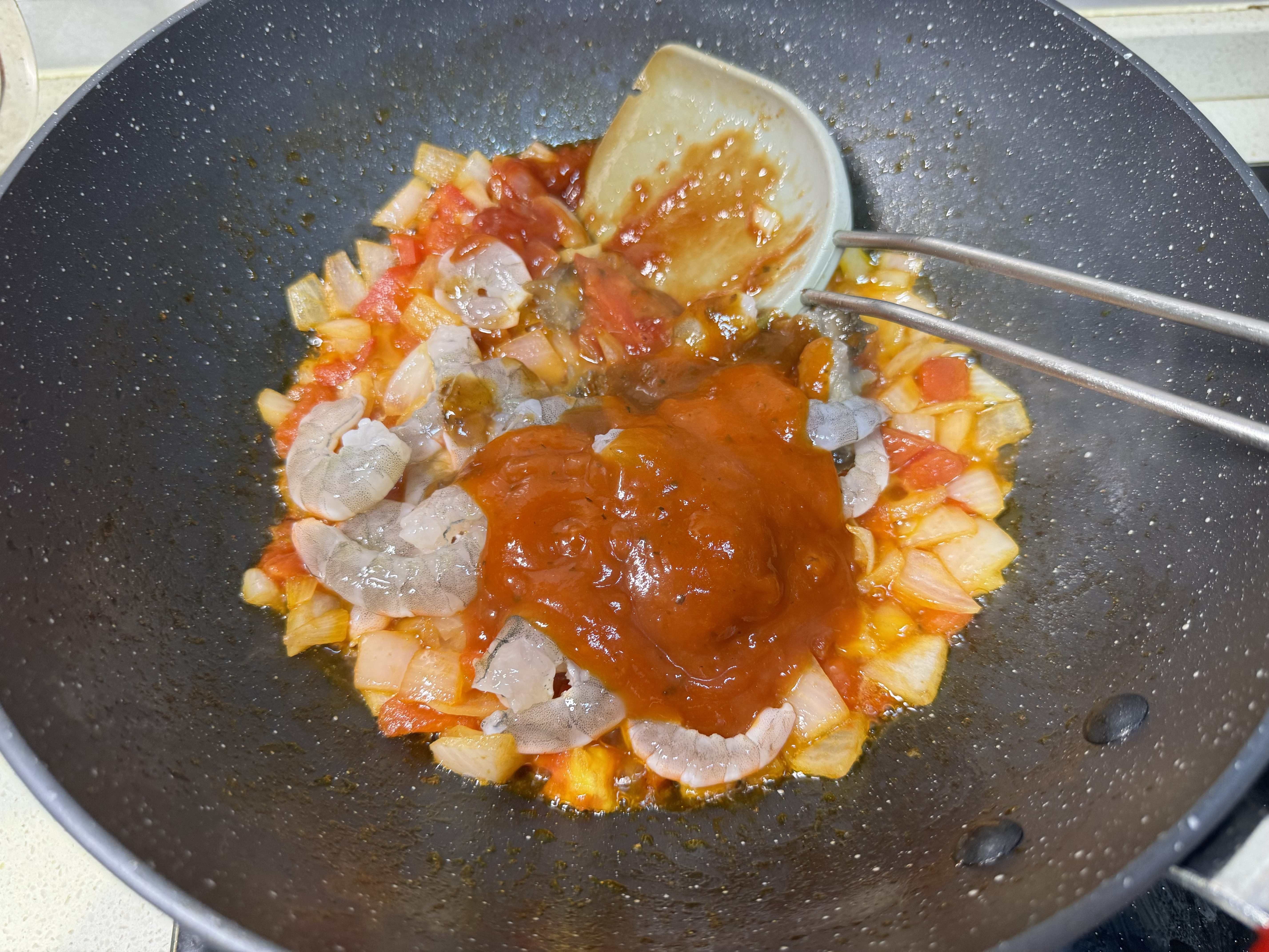 5,加入虾仁和海参,调味我加了一勺番茄酱和一大勺意大利面酱,翻炒均匀,如果酱料太干可以加少许水稀释一下。