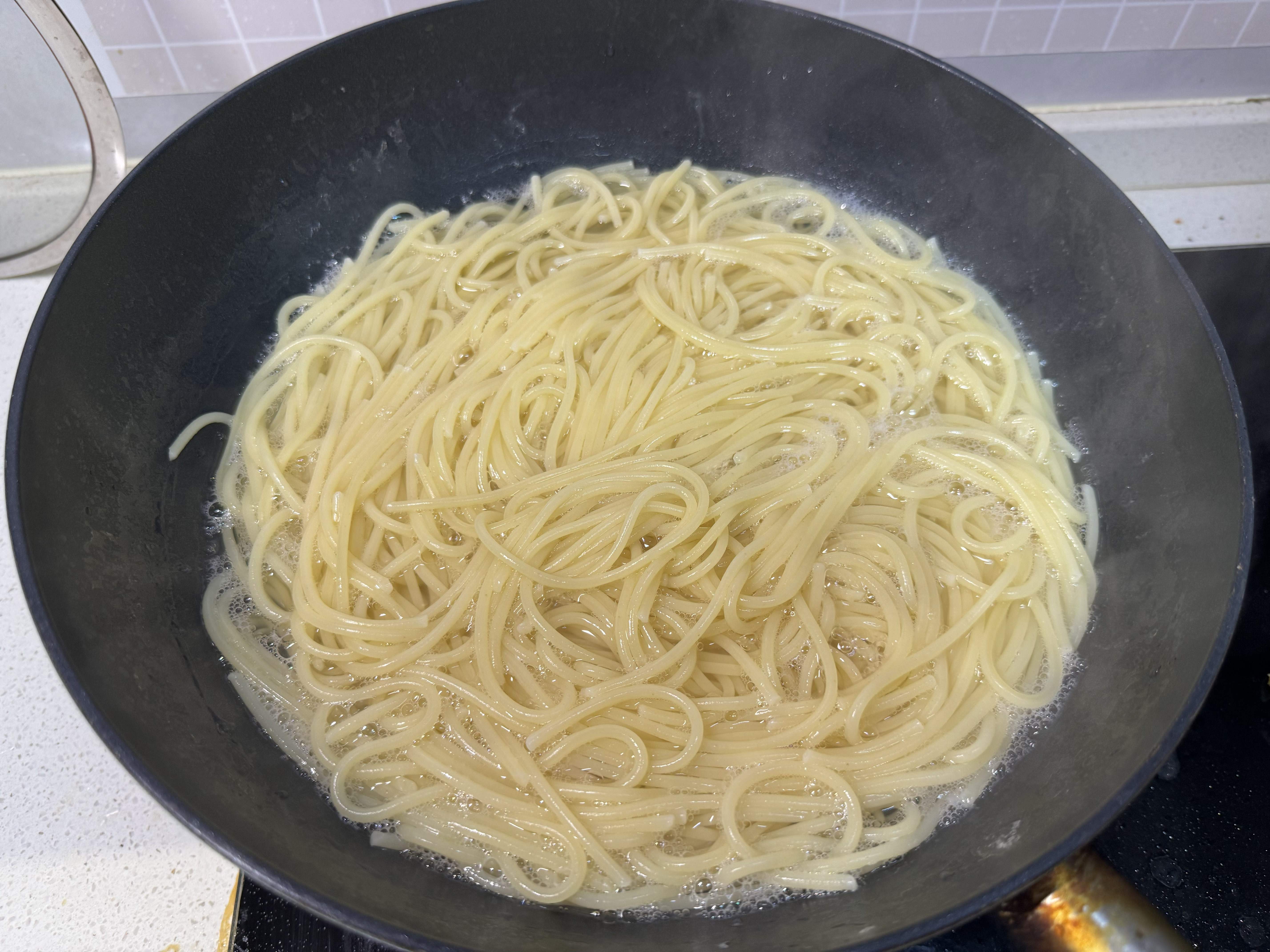 意大利面煮的时间比我们普通的面条要久一些,煮大概十分钟后可以拿一根掐断,看下截面是否还有白芯,因为意大利面的粗细不一,煮制需要的时间也不太一样,十分钟是大概的时间,细一点的面可以稍微减一两分钟,粗一点的就多煮一会儿。