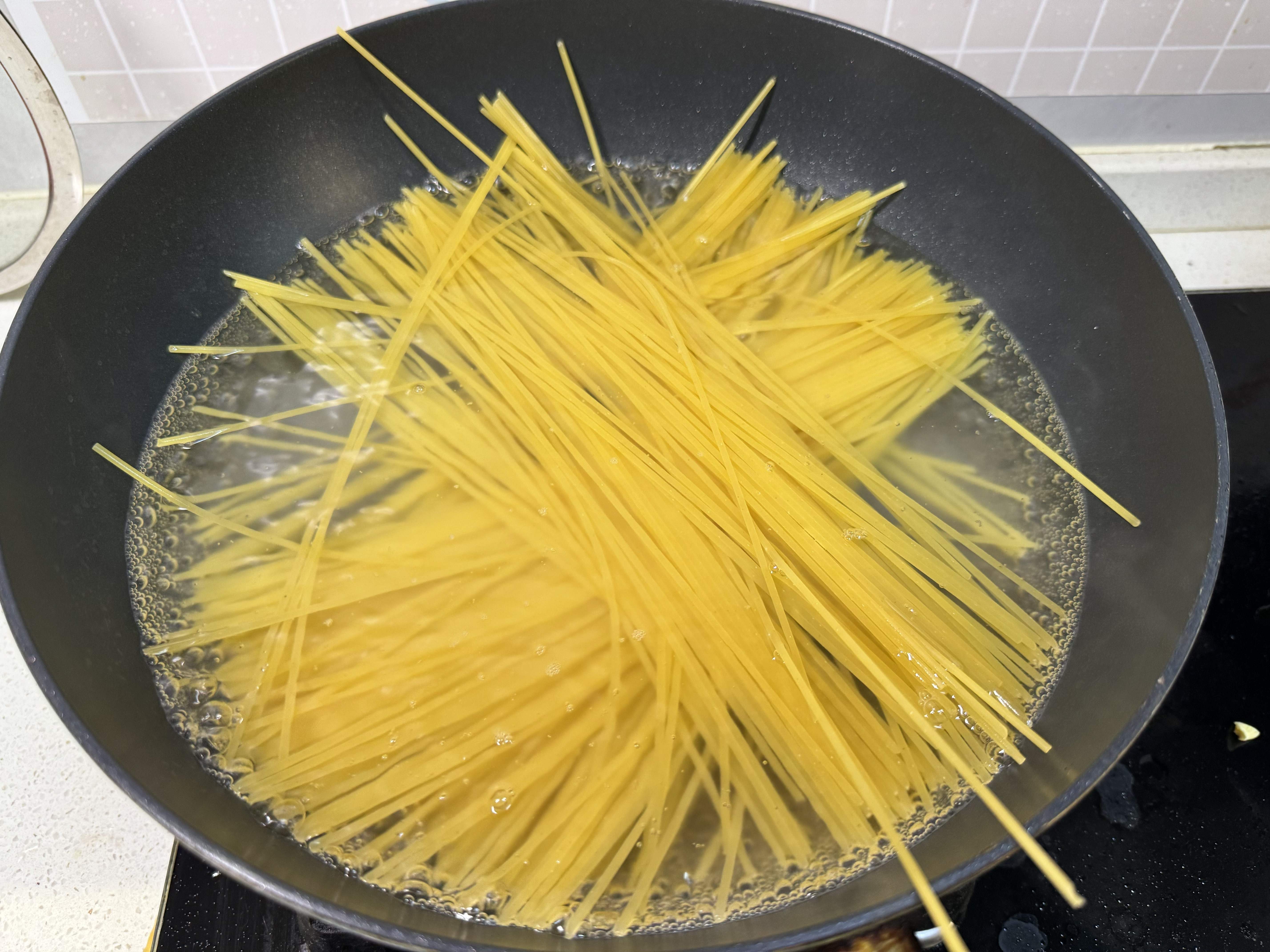 2,煮的过程水要加足,意面煮的时候会吸水,煮好捞出来,用凉水冲洗干净并沥干水分备用。