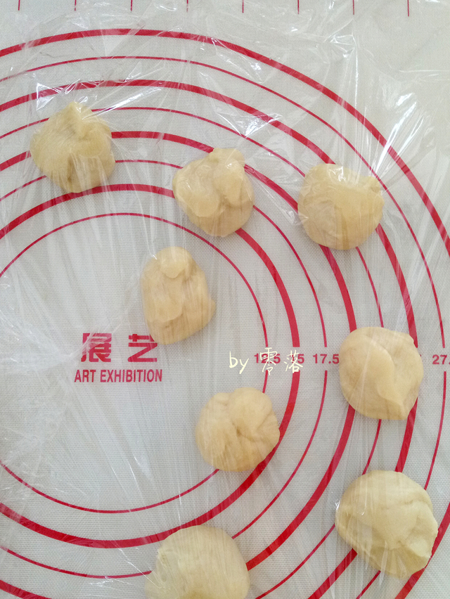 3、将面团分成16份,稍稍滚圆,覆盖上保鲜膜;