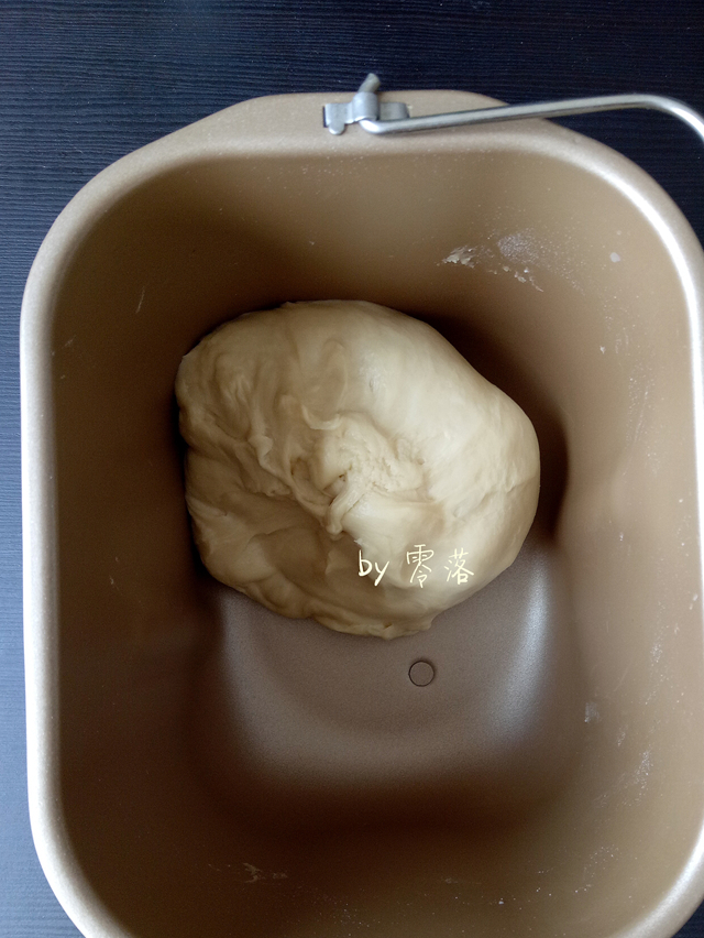 1、将除蜜豆外的所有材料都放入面包机内胆,盐和酵母分别放在两端;启动“和面”程序,将面团揉至扩展阶段;