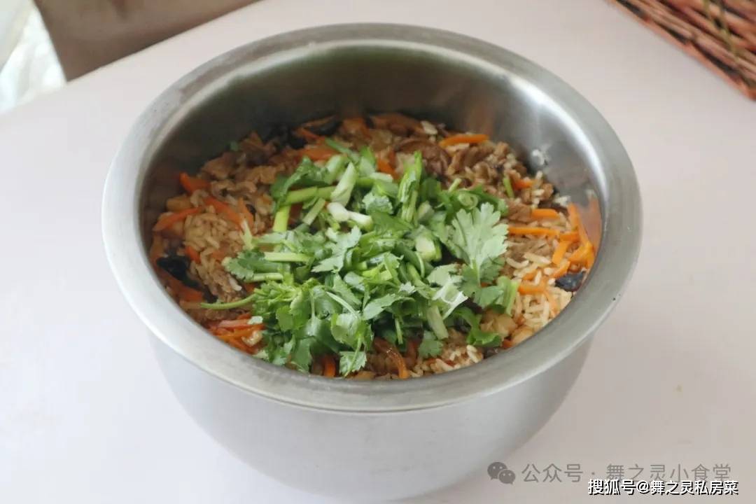 米饭煮好了,撒入适量的香菜,趁热拌匀就可以盛出来享用了。哇特别有食用,而且超级超级的营养好吃,难怪一家人都吃得很开心。