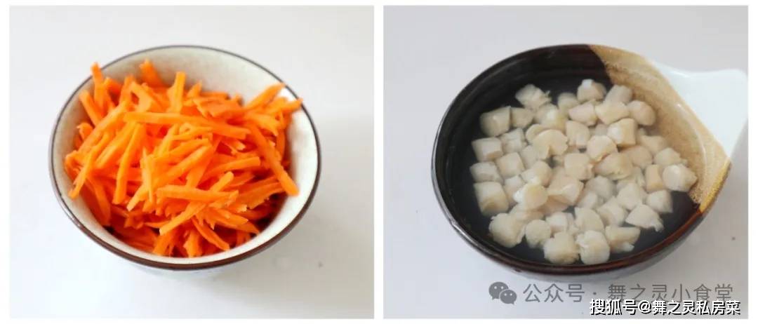 2、还有干贝也是要提前浸泡一个小时的,然后用手稍微碾压开,胡萝卜用了一根,擦成细丝。