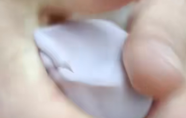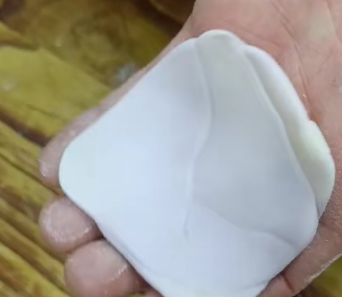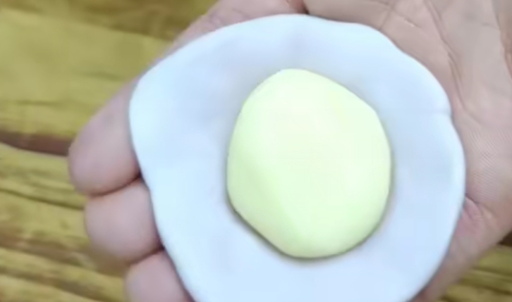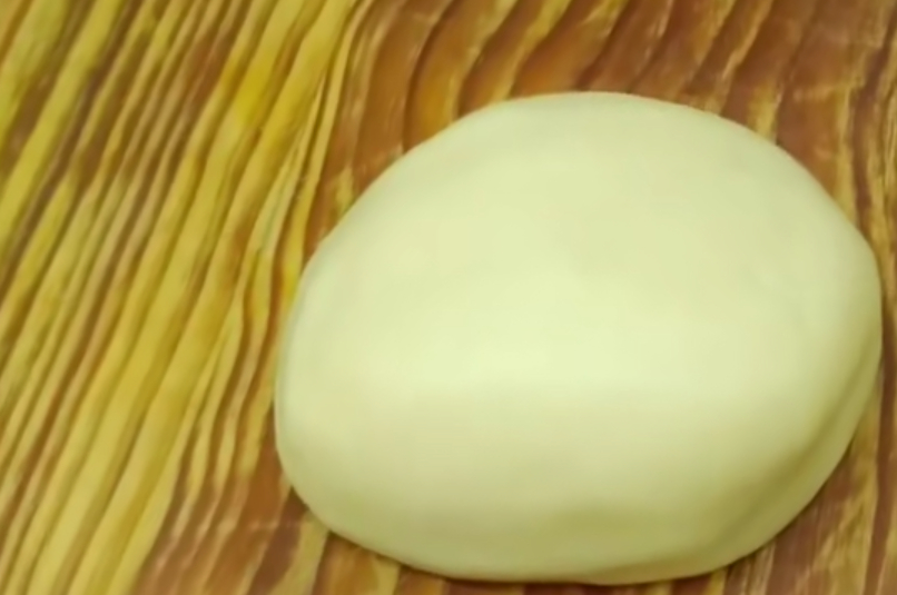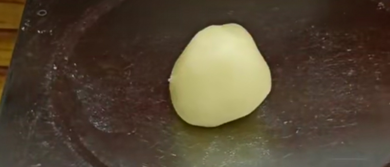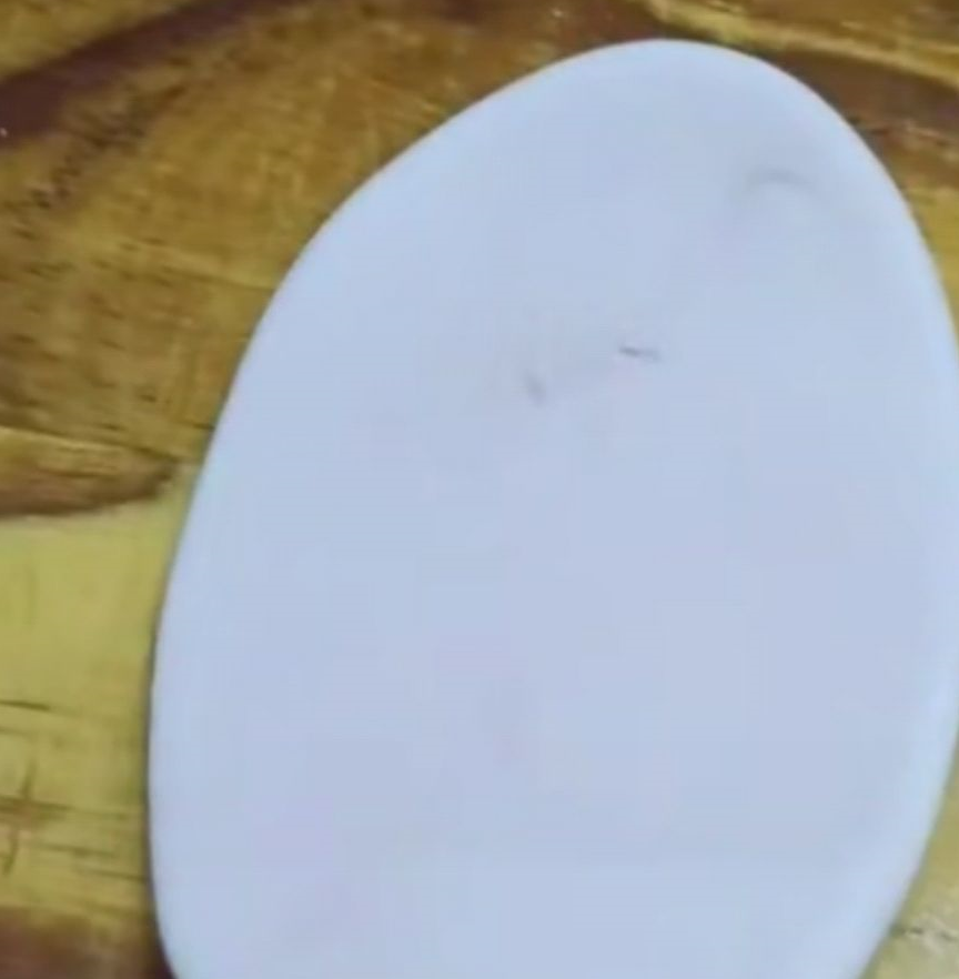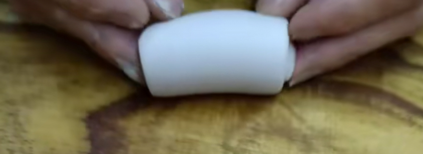 接着把圆球按扁,擀成椭圆形的长条,
