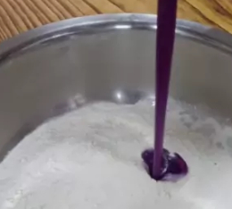 充分搅拌均匀至融化无颗粒,然后把混合好的紫薯汁分次倒入面粉中,