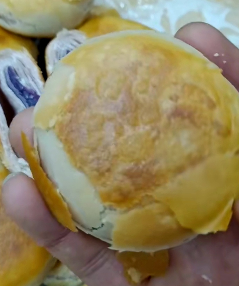色泽金黄发亮,没晾凉饼就酥得开始掉渣,都不舍得用夹子夹,生怕酥皮都掉成渣了,只剩馅吃了,太可惜了。