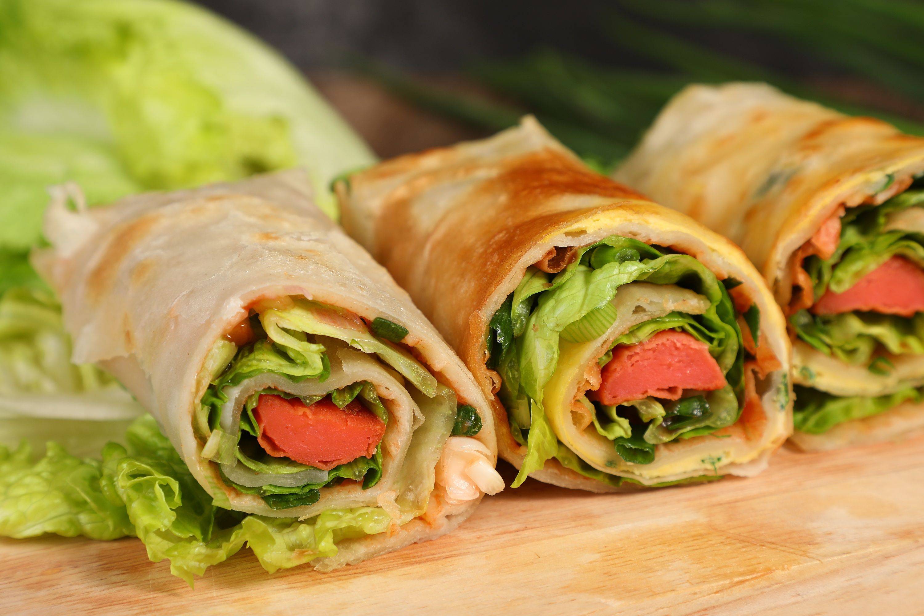 - 可以根据个人喜好搭配生菜、土豆丝、豆皮等配菜,再刷上自己喜欢的酱料,如海鲜酱、蒜蓉辣酱等。