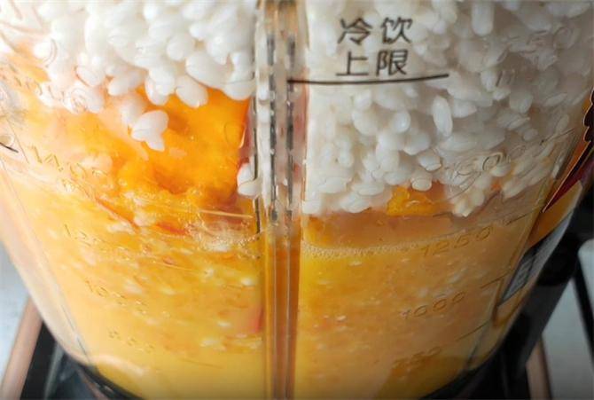3.然后再把大米的水分控干,倒入料理机,我们加入200到300毫升的温水,加温水一会儿发酵的时候能够更快一些,一定要用料理机多打几遍,把它打的越细腻越好。