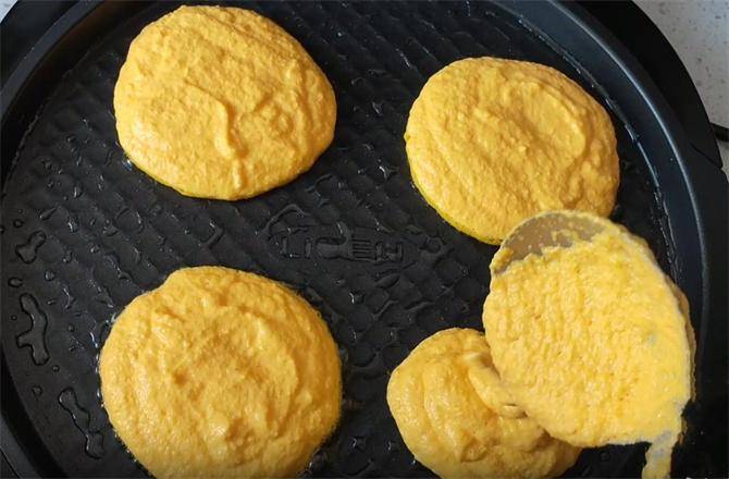 6.电饼铛开小火刷油,一勺面糊一个饼,要朝着中间的位置倒,这样做出的饼会比较圆。