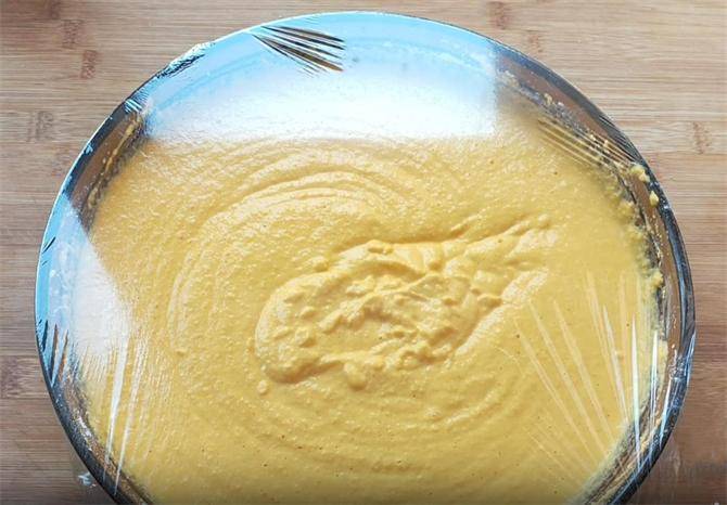 4.倒入碗中,加入四克酵母,把酵母搅拌至充分溶解,这样面发的会更快一些,然后多次少量加入约200克左右的面粉中,高筋粉都可以,边倒边搅拌,最后我们搅成像这种粘稠程度的面糊就可以,然后盖上保鲜膜密封醒发30到40分钟。