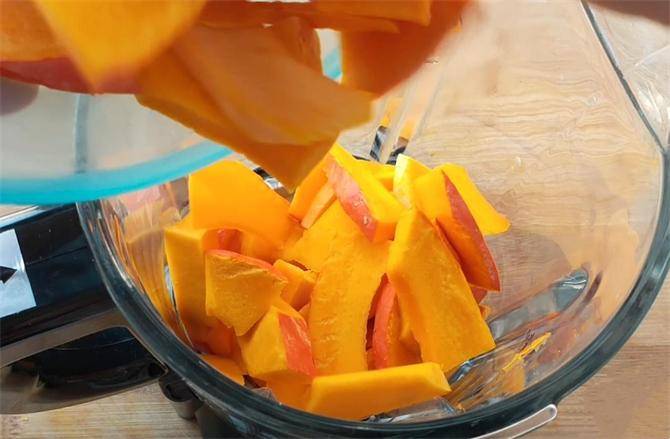2.我们再准备南瓜600克,洗净切成小块,放入料理机中,因为料理机能够把南瓜皮打碎,所以说我们不需要去皮,因为南瓜皮的营养价值很高的。