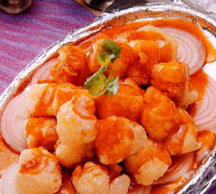3、铁板烧热,抹上牛油,铺上洋葱圆片,放人炸好的鳕鱼丁,淋上沙茶酱即可。