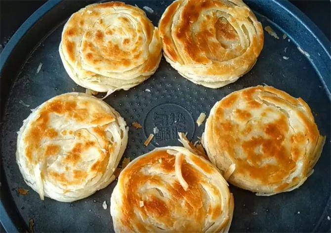 8.这时我们起锅开小火,锅中稍微多放一点油,油温四成热下入饼坯,因为这个饼层次特别薄,如果高油温下入,很快就会表面变糊,烙至边缘变色,我们翻面,烙至底面微黄,我们再次翻面,烙制这个油酥饼一定要小火慢烙,反复翻面,大约烙制约四分钟左右,烙至两面金黄酥脆,层次都已经出来了即可出锅。