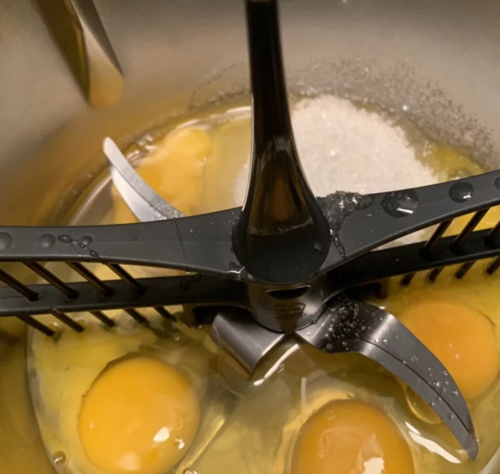 5.主锅插上蝴蝶棒,然后打入准备好的5个鸡蛋,15分钟/45度/速4,8分钟左右以后把量杯盖打开,这样会使得打发的效果更好