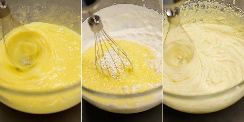 面粉和泡打粉混合过筛,筛入上一步的混合物中。用打蛋器先手动搅拌到面粉完全湿润,再开电动打蛋器,高速搅打1分半钟。