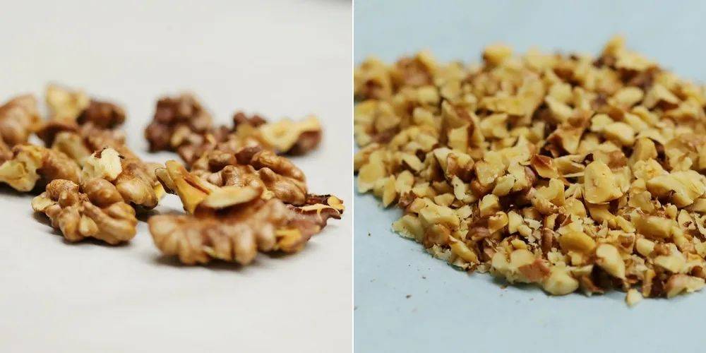 如果是生核桃仁,需要提前烤熟。烤箱上下火180℃烘烤6-8分钟,烤出香味,核桃仁分量较少注意不要烤糊了。烤好冷却以后,切成核桃碎。