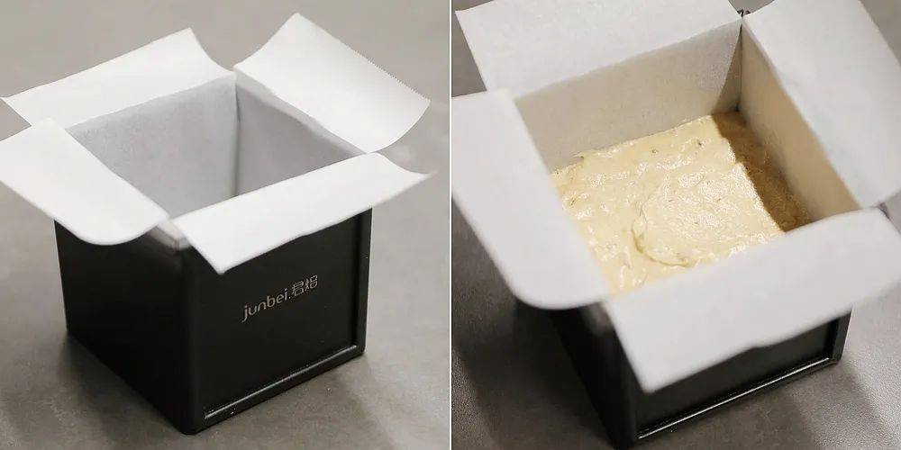 在模具内部铺油纸以方便脱模,也方便模具清洁(也可以不铺,烤好以后直接倒出来脱模,非防粘模具要抹油防粘)。