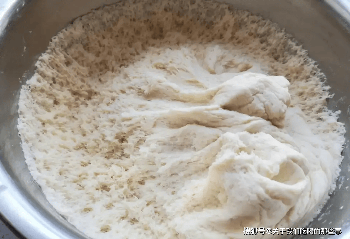 4、发酵好了,面团会出现密集的蜂窝。将面团取出,撒些干面粉,在案板上反复揉搓,把空气排出。